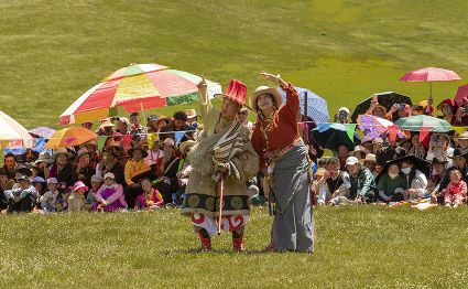 據(jù)說早在吐蕃時期,人們以村寨為單位,在本教僧人的帶領下高舉幡桿,手拿青棵、麥穗,繞田間地頭轉圈,祈禱神靈保佑,獲得豐收。儀式結束后,就在草場上展開角斗、斗劍、耍梭標等活動。格魯派興起后,這一活動仍得到保留,只是在繞地巡游時,人們要舉佛像、背經(jīng)文,文體活動也增加了賽馬、射箭、馬術、藏戲、民間歌舞等內(nèi)容。解放后,革去了繞地巡游等一些宗教儀軌,增加了許多休閑娛樂、物資交流的內(nèi)容?!巴?jié)”沒有固定日期,各地根據(jù)農(nóng)事而定,一般在秋收前(8月)擇吉日舉行,時間1-3天。