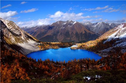 丹巴的秋是有著美麗色彩的季節(jié),你瞧,在峽谷兩岸的山巔,那一簇簇綠樹在一夜之間竟然點綴上了黃的、紅的顏料,就像是一名丹青能手不小心間打翻了調(diào)色盤,讓那些靈動的顏料在樹冠上潑灑。黃色的樹葉正印證了“滿樹盡帶黃金甲”的意境,黃得透徹,黃得潔凈。而那些紅色的樹葉,猶如盛開的鮮花,在逐漸蕭條的秋日里顯露出勃勃生機……那一片片黃紅綠相間的顏色,一寸一寸的往下挪移,讓看慣了春色綠野滿山的人們驚呼大自然的鬼斧神功之作。山腰,蔥綠的樹一棵連著一棵,密密層層,頑強地抵抗著秋風(fēng)的寥落,然而,那黃的紅的顏料終歸于要流向峽谷底,所經(jīng)之處,風(fēng)刺骨,葉瑟縮,大地又將再次被剝蝕掉華麗的外衣,露出山的嶙峋。我想,在山巔,那些樹葉在秋寒的作用下,依依不舍地與樹枝作別,隨風(fēng)抖落,在樹林中上下翻飛,猶如一只只美麗的彩蝶在林中翩翩起舞,當落到地面上時,發(fā)出生命即將逝去時的低低嘆息聲,然而那哀傷卻沒有醞釀太久,幾只小蟲迅速地聚集在葉片底下,為尋找到過冬的庇護所而興奮不已,那些葉片也感受到了生命存在的意義,為自己即將化為塵土前還能再次發(fā)光發(fā)熱而激動。跟隨著秋的步伐,獨自一人穿行在秋色滿滿的樹林中。眼前,一片片落葉漫空飛舞,伸出雙手,讓那些黃的紅的葉片降落在手心里,一絲淡淡的蘋果香味從小小的葉片中透出,悠悠的在我鼻尖縈繞。那一片片落葉,不正是秋日向大地母親發(fā)出的明信片嗎!春夏兩季,大地母親用自己的乳汁哺育著這些葉片,泛著健康的綠色,渲染了大地,茁壯的成長。那透心的綠,將大地裝扮得格外的妖嬈,充滿了無限的活力。秋日漸近,它們在秋風(fēng)的浸透下,剝蝕掉綠色的外衣,消耗掉多汁的綠葉,逐漸的消瘦,最后薄如蟬翼,在秋風(fēng)的吹拂下,在大地母親的召喚下,終于脫離枝條,晃晃蕩蕩的飄向地面。