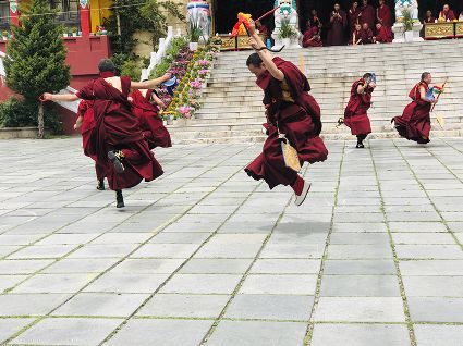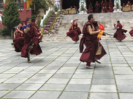 跳神儀式開始,南無寺內(nèi)鼓號(hào)齊鳴,喇嘛身著顯耀盛裝,點(diǎn)燃新綠松枝,幾縷藍(lán)色煙紋升起。一支由法鼓、鈸、海螺、法號(hào)等組成的寺廟樂隊(duì)自大殿而出,順時(shí)針繞場一周落座場邊,群神出場繞圈而舞,以示凈化場地,祈請諸神入位。接著,象征護(hù)法神舞、骷髏舞、鹿神舞、黑帽咒師舞和金剛力士舞的演員手持各類法器挨個(gè)入場手舞足蹈。舞蹈的起落根 據(jù)場邊奏響的器樂節(jié)奏進(jìn)行。最后由眾神驅(qū)鬼逐邪,押送“朵馬”(由糌粑捏成用以供神施鬼的食品)至寺外拋丟焚燒,以示驅(qū)逐一年的邪魔,祈禱來年安樂。
