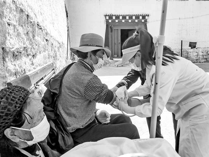 圖為入戶開展腫瘤防治宣傳時醫(yī)護(hù)人員提供免費量血壓服務(wù)。