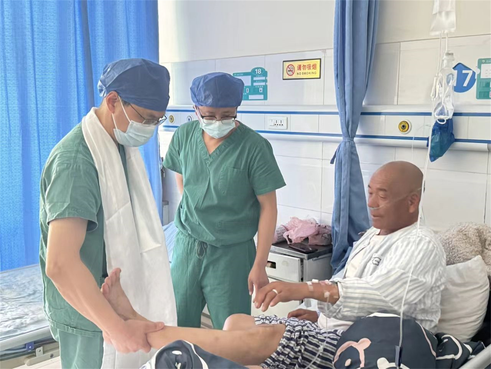 病房里和李秀文同樣幸運(yùn)的還有60歲的拉空登巴大叔,登巴大叔被膝關(guān)節(jié)疼痛困擾多年,雙腿膝關(guān)節(jié)變形,上下樓梯時(shí)痛感會(huì)更加明顯。當(dāng)天一大早,登巴大叔就從家里趕到縣醫(yī)院,做術(shù)前準(zhǔn)備?!昂荛_心,我滿足了手術(shù)條件,希望手術(shù)順順利利!”登巴大叔激動(dòng)地說。