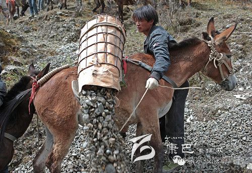 每天早上6點(diǎn)多,王玉海和同伴趕著騾子隊,從白玉縣縣城旁邊的住地步行約1小時到達(dá)德沙村,約8開始從離索道橋約300米的路邊沙石場裝運(yùn)碎石。他們通常工作到下午5點(diǎn),每只騾子在海拔3000米左右的高度,來回運(yùn)送20次左右,每只騾子運(yùn)輸碎石大約在3000公斤左右。這些騾子正當(dāng)強(qiáng)壯年,年齡大約在三四歲,通常在坡度在30度以下的,最大負(fù)重約800斤。