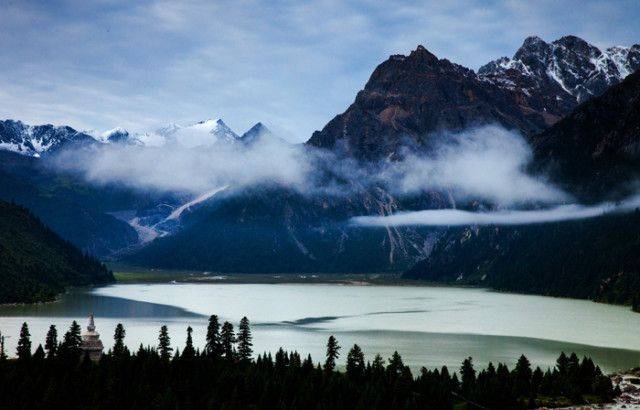 置身于德格的新路海,一汪碧綠的水,靜靜躺在群山的懷抱之中,清晨的薄薄霧氣彌漫于湖水之上,有種朦朧的仙境意味,寧?kù)o而吉祥。或許只有清晨那一只只不知名的鳥兒掠過湖邊,才能打破這一片仿佛凝固的寧?kù)o。