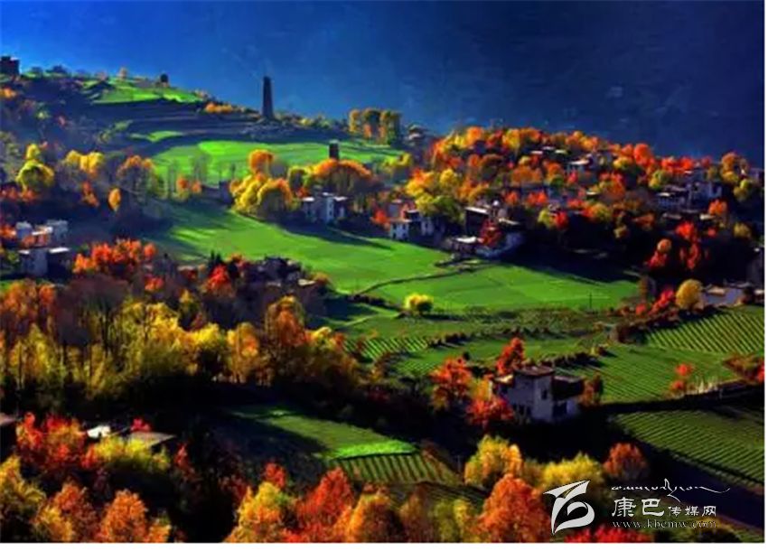 位于四川省甘孜州丹巴縣東北部,白色的藏房、金頂?shù)乃聫R還有歷史悠久的古碉樓在透藍(lán)的天空下隱約可見,猶如置身于桃花源之中。