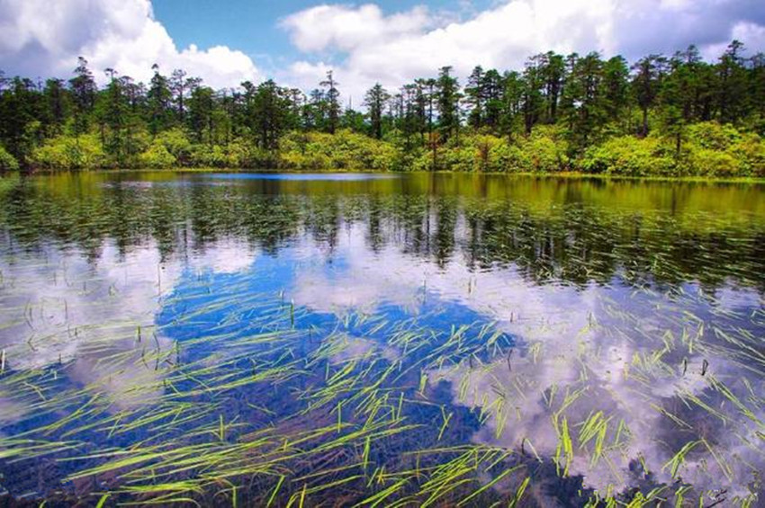 繼續(xù)前行,下一站既是木格措。木格措漢名:野人海,水源來(lái)自于身后女?huà)z雪山的積雪融水,水質(zhì)清冽,能見(jiàn)度極高,湖四周群山環(huán)抱,紅海、黑海、白海等幾十個(gè)小海子圍繞在周?chē)?,如眾星拱月般。木格措風(fēng)光秀美,“臥虎觀月”、“雙霧墜?!钡染坝^最為獨(dú)特。