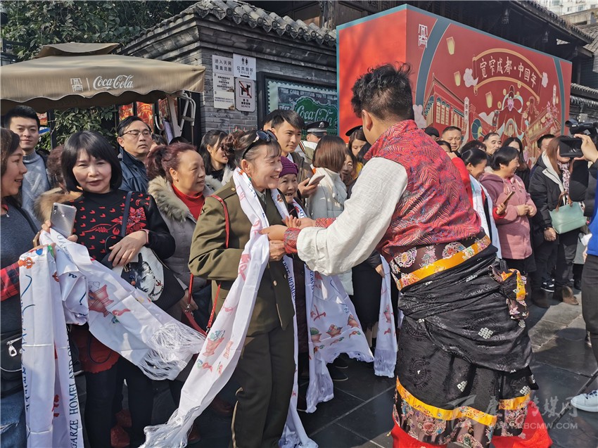 快閃還未開始,20名身著少數(shù)民族服裝的藏族姑娘小伙,便成為了一道最獨特、亮麗的風(fēng)景線。隨后,他們給游客們帶來了獨具甘孜特色的歌舞《康定情歌》《甘孜踢踏》,悠揚的歌聲、奔放的舞步,讓圣潔甘孜大美天成的獨特風(fēng)韻完美展顯,吸引了春熙路如潮的人群,被歌舞魅力感染,不少市民隨著他們一起唱跳了起來。而此時的成都寬窄巷子里,也正在演繹著一場震撼的“快閃”,四名穿著格薩爾王服飾的大將,身披鎧甲、手持刀劍,格外威武帥氣,市民和游客紛紛拿出手機拍照留念?!翱扉W”結(jié)束后,熱情的甘孜兒女為周邊的觀眾獻上潔白的哈達,向他們致以美好的祝福,并誠摯歡迎他們到甘孜旅游。
