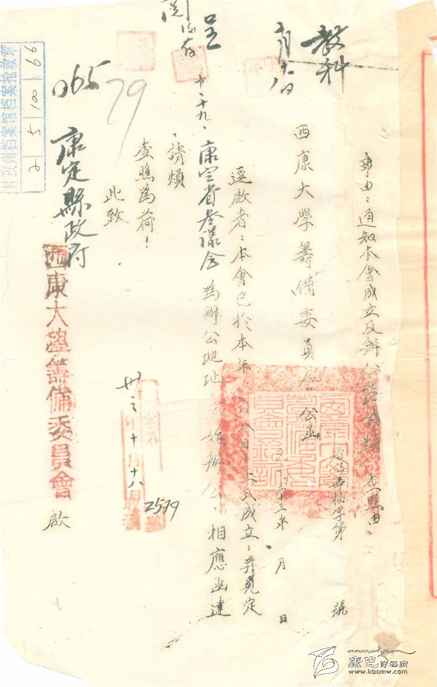 根據(jù)這份資料上“教科:10月18日”和“呈閱后存:10月19日”等字樣推算,這個“西康大學(xué)籌委會”可能是在10月8日成立的,這份函件是送往康定縣政府,告知“籌委會”辦公地點的一般函件。