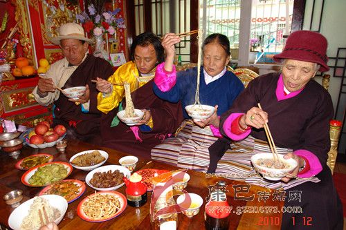 巴塘人一年當(dāng)中有很多重要的節(jié)日,而最重要的莫過于過春節(jié)。隨著農(nóng)歷新年的來臨,巴塘人過春節(jié)的氛圍也越來越濃烈了。掃塵、貼春聯(lián)、殺年豬、罐血腸、樹經(jīng)幡、獻(xiàn)“切瑪” 、曬牛肉干、做長面、炸“花茹” 、 釀青稞酒等等,人們臉上綻放出春天的笑顏,喜逐顏開迎候新春佳節(jié)的到來。而在眾多的風(fēng)味飲食中,炸“花茹” 、 吃長面(當(dāng)?shù)厝朔Q之為“金絲面”)是巴塘人春節(jié)時(shí)家筵中必不可缺的美食佳肴。