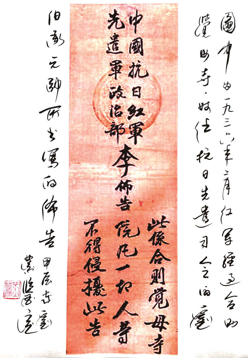 該布告和其他的布告在書寫形式上有所區(qū)別,不是現(xiàn)在常見的橫向的,是豎向的,按照上中下分三部分,發(fā)布方、責(zé)任人、發(fā)布內(nèi)容。它的落款也就是發(fā)布方的單位在上面,左右對(duì)稱,蓋章可以辨認(rèn)為:中國(guó)工農(nóng)紅軍第四方面軍第三十軍政治部。中間是發(fā)布人李先念的姓李,比其他字大一倍,以示突出。在下方是布告的內(nèi)容。書寫者以行書書寫,一氣呵成,整體結(jié)構(gòu)勻稱,字體大小適中,內(nèi)容簡(jiǎn)明扼要。布告歷經(jīng)多年,保存完好,說明寺院的收藏者對(duì)布告的內(nèi)容認(rèn)可,對(duì)書寫者書法充滿敬意。