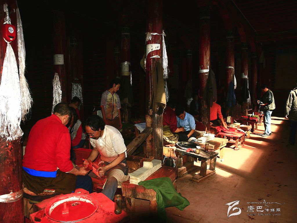 德格印經院的各種傳統(tǒng)產業(yè),當?shù)鼐用竦纳a勞動都立足于當?shù)刈匀画h(huán)境資源,并且全面地支持著傳統(tǒng)印刷技術系統(tǒng)的各階段。包括“瑞香狼毒”的草根造紙方法,均與德格地區(qū)的傳統(tǒng)產業(yè)有關。藏紙是當?shù)鼐用裼脗鹘y(tǒng)手工方式制造的印刷紙,是用一種叫“阿交如交”(瑞香狼毒)草本植物根須為原料制造而成。這種紙的顏色微黃,質地較粗厚,但纖維柔軟,不易脆,吸水性強,同時還具有防蟲蛀、防鼠咬,久藏不壞的特點。印經院的印刷用色通常分為紅版和墨版兩種。木刻印版的刻制工作更為艱辛,印經院選聘藏文知識高深淵博的名士將所要刻制的圖書進行嚴格細致的三級審校,才可由聘請的藏文書法技藝精深的學者嚴格按照藏文書法正楷要求開始橫版書寫工作,他們將圖文描繪在半透明的薄紙上反貼在板面上。刻工們依據(jù)紙上的色差進行刻制,刻完后編師們在清樣上還要進行三校,版面改動較多的必須進行重刻,一般的進行補刻。直至完全準確無誤時將印版放在酥油里浸泡一天后,取出曬干,再用一種名叫“蘇巴”的植物根熬水洗凈曬干,至此一塊印版的制作才算全部完成,可入庫上架和進行印刷。通常情況下,技藝嫻熟的一名工人每天完成一張書版的單面刻制,畫版刻制工作量更大。雕刻技工都是來自本地及周邊地區(qū)的民間藝人。