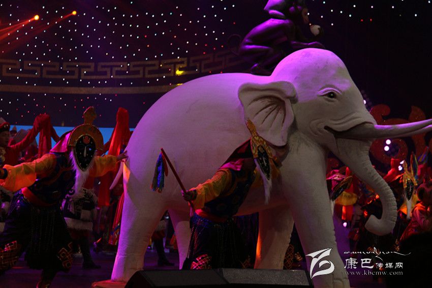此次藏歷新年春晚被命名為“圣潔家園”,為了應(yīng)“家園”這個(gè)景,導(dǎo)演組頗有“心機(jī)”的將藏元素“和睦四瑞”搬上了舞臺(tái),在開場(chǎng)舞中,兩個(gè)用石膏打造的、栩栩如生的“和睦四瑞”被演員緩緩?fù)粕衔枧_(tái),贏得觀眾陣陣歡呼。在民間傳說中大象、猴子、白兔、貢布鳥共同發(fā)愿行持善法,貢布鳥鼓勵(lì)同伴們開始持守五戒,并一直堅(jiān)持不懈動(dòng)員其它眾生嚴(yán)守五戒。在它們帶動(dòng)、勸說下,動(dòng)物們都能漸漸做到互不損害、如理如法在木森林中和平度日,以其厲行善法之因,天人也降下和合雨水。后來,整個(gè)大地之上,莊稼豐熟、植物茂密、鮮妍之花滿目盛開,整個(gè)國家喜獲豐收、財(cái)富圓滿。晚會(huì)也是想利用“和睦四瑞”寓意人民生活團(tuán)結(jié)和睦、和平寧靜的美好愿望。