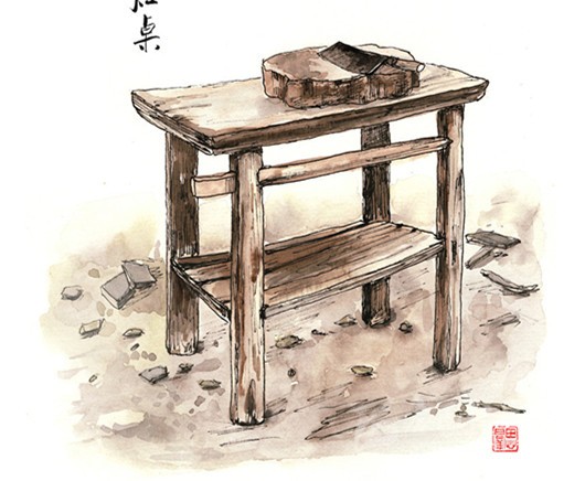 在我們家,灶屋里砌著一個(gè)四方形兩灶孔的大正灶,兩條寬板長(zhǎng)凳靠墻擺放,交于墻角,像木匠的大曲尺,半圍著象征一家之主的正灶,其中一條正對(duì)著灶門口。灶與凳之間的通道,僅容曲膝而坐。灶上常年擱著烏黑的鼎灌和鐵鍋,灶的背面則立著一張長(zhǎng)條狀的灶桌。灶桌是洗碗和切菜的地方,在其橫長(zhǎng)的縫隙里插上接手板,懸空于灶面之上,擺上碗筷,又起到了飯桌的功能。灶屋進(jìn)門的另一面墻,靠墻而立的,是高高的碗欃和一個(gè)瓦水缸。碗欃是平素放碗放剩菜的地方,本是漆了老紅色,卻因西墻的木格窗小,光線幽暗,與四壁及樓板的烏黑融為了一體。水缸上口有一塊擱板,板上放兩只寬口瓦缽,缽里各放著一只竹筒水勺,一大一小。每天早晚,家人擔(dān)了木桶,挑來(lái)井水倒入水缸,此處的地面,長(zhǎng)年潮濕。灶屋是我們一日三餐吃飯喝茶休息閑談的場(chǎng)所,煙火歲月,多是在此度過(guò)。我開(kāi)蒙上小學(xué)后,每到夜晚,吃過(guò)飯后,將煤油燈盞移到寬板長(zhǎng)凳,雙膝跪地,伏在凳灶之間的空隙里寫作業(yè),有時(shí)一不小心,額前頭發(fā)就被燈盞的火焰燒得焦臭。我自小愛(ài)學(xué)習(xí),成績(jī)很好,每學(xué)期都有獎(jiǎng)狀,老師夜里來(lái)村間家訪時(shí),也常來(lái)我家坐,是我父母最大的榮光。