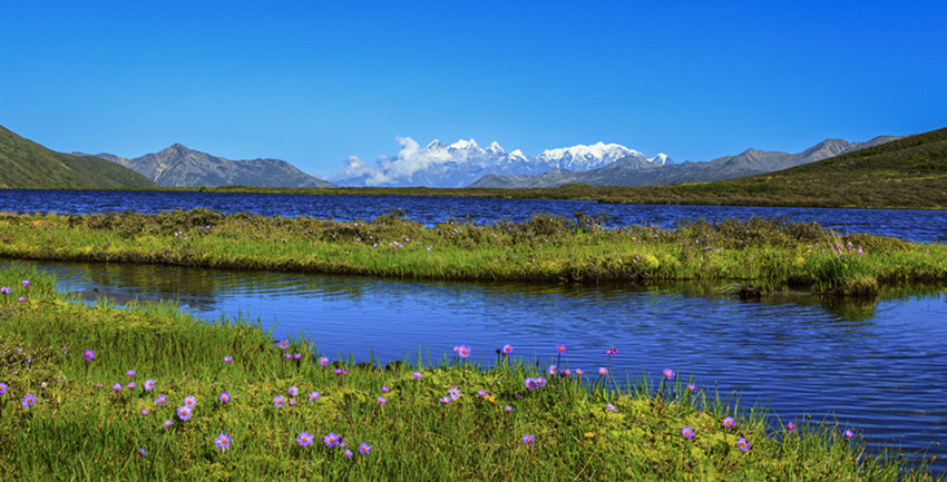 在山谷中穿行十余公里,路面一點點抬起,上了貢嘎山脈,徑直進入康定情歌景區(qū)。隨著海拔的升高,涼意漸濃。山依舊是主角,地勢卻變得平緩而開闊,有茵茵的草地,有大小湖泊,沿途山泉潺潺,野花點綴,空氣清幽,方才單調的褐色很快被淡忘。山體漸次出現(xiàn)密集而低矮的灌木,枝條筆直地立著,有高寒山區(qū)的凜然之氣。灌木一層層上延,樹木雜多,大片的原始森林漫過山體,將大山包裹起來。遠處,藍天白云之下,貢嘎雪山在群峰中探出頭來,擦亮高空的陽光。澄明的空氣里,仿佛可以聽見雪??┛┑匦?。剎那間,仿佛所有的大山,都開始舒展筋骨。
