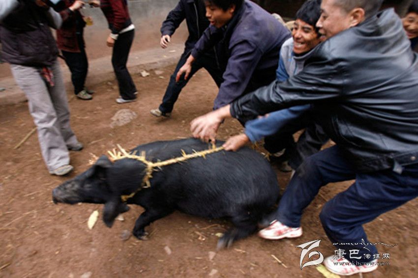 割豬蹄給娃娃們拿到山上玩。大人陪他們?nèi)计痼艋?,指揮他們將豬蹄不分你我地拋進火中燒熟后,你一塊,我一坨地掏來吃,以養(yǎng)成團結友愛的道德風尚。