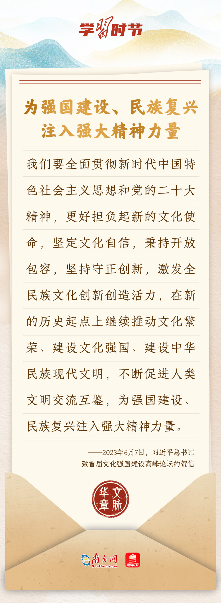 “中華民族在幾千年歷史中創(chuàng)造和延續(xù)的中華優(yōu)秀傳統(tǒng)文化,是中華民族的根和魂?!绷暯娇倳浂啻瓮ㄟ^發(fā)賀信、寫回信等方式,表達著對弘揚中華優(yōu)秀傳統(tǒng)文化的殷切希望,飽含深情、字字暖心、催人奮進。讓我們一起“讀”信。
