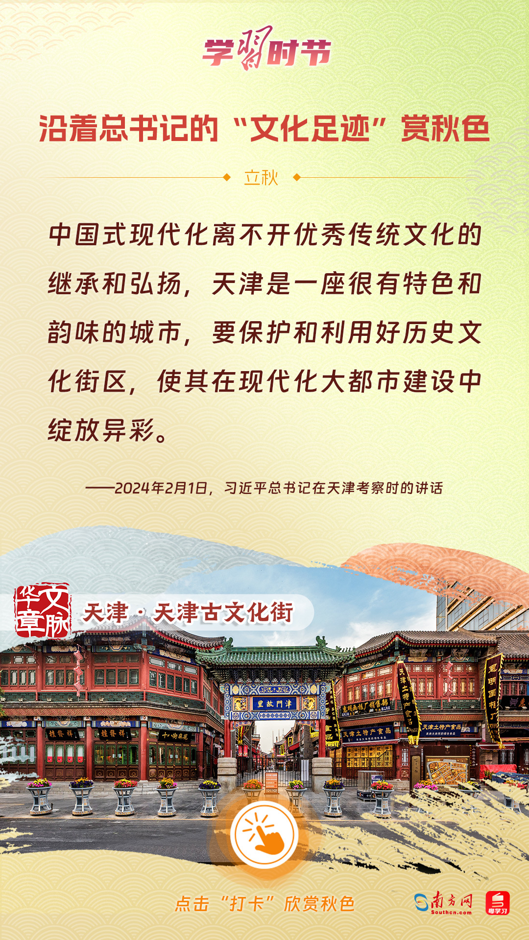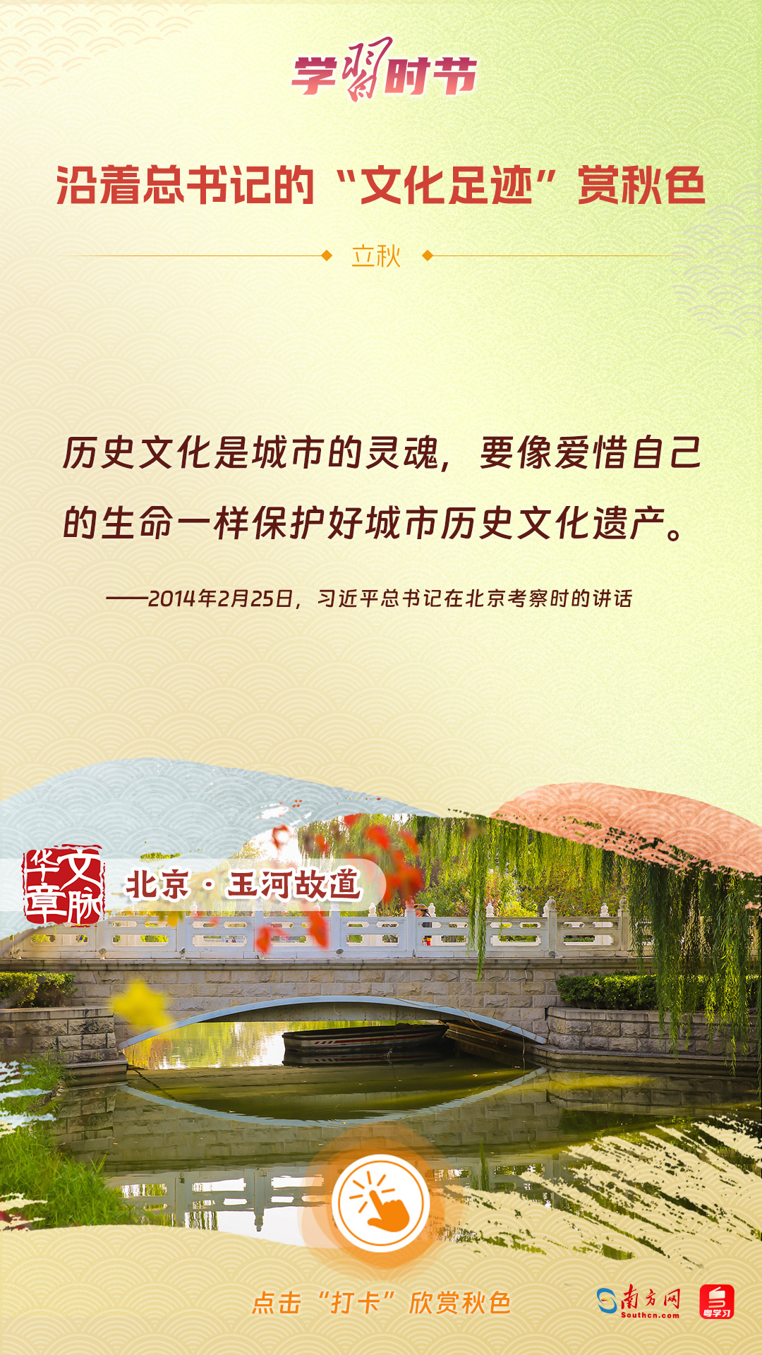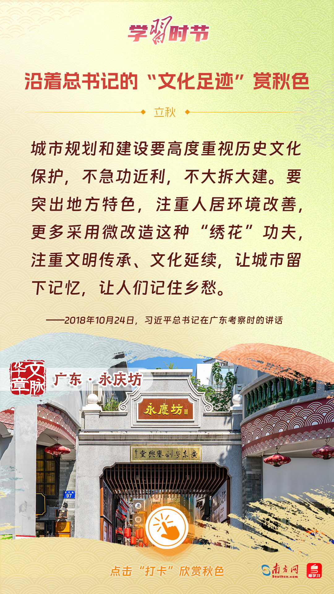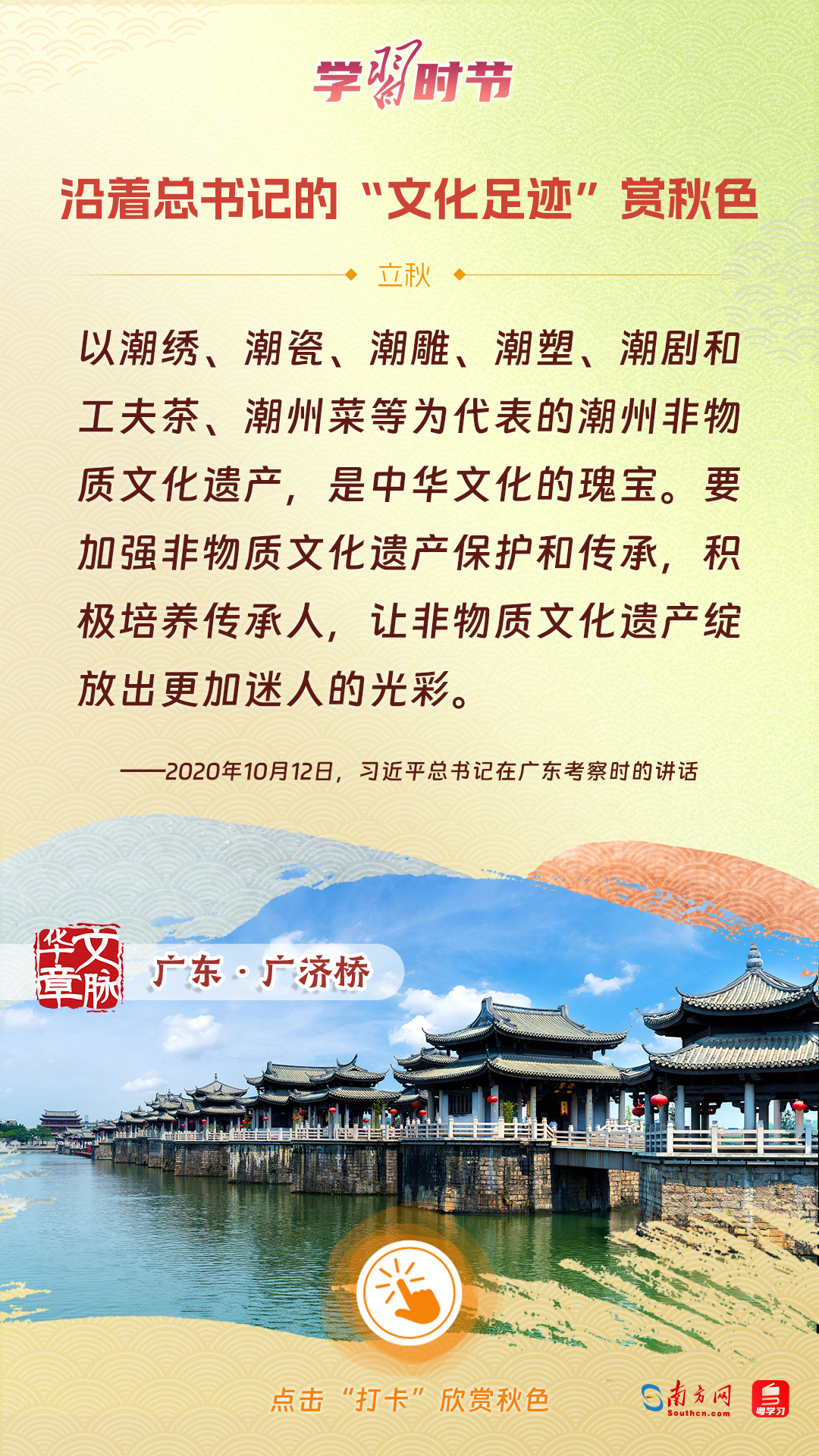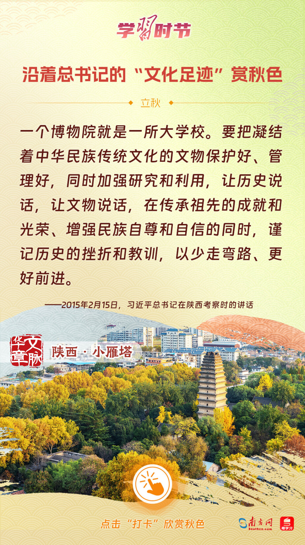 立秋之際,讓我們一起跟隨習(xí)近平總書記的足跡,學(xué)習(xí)習(xí)近平總書記關(guān)于文化建設(shè)的重要論述,感受全國各地文化地標(biāo)古跡的秋意,汲取文化自信的強(qiáng)大力量。