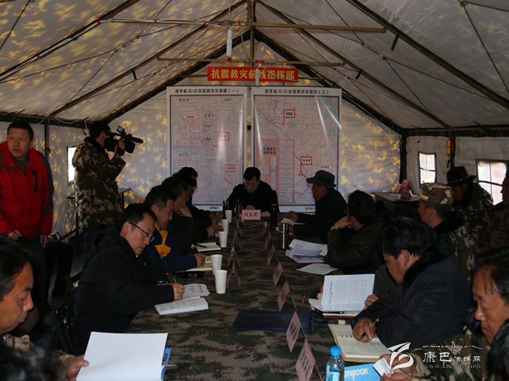 在前線指揮部,胡昌升主持召開(kāi)前指工作專題會(huì)議,傳達(dá)了省委書(shū)記王東明和省長(zhǎng)魏宏到我州地震災(zāi)區(qū)調(diào)研指示精神,聽(tīng)取前線指揮部辦公室和營(yíng)地各單位、康定縣、道孚縣關(guān)于抗震救災(zāi)工作的匯報(bào)。