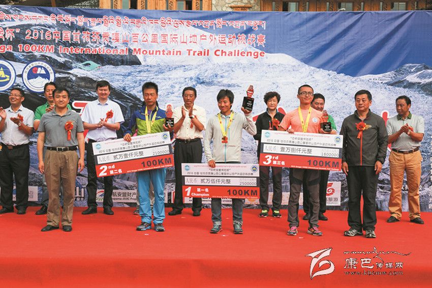 27日凌晨5時(shí),參賽選手從康定情歌廣場(chǎng)出發(fā)后,運(yùn)動(dòng)員們不畏艱險(xiǎn),你追我趕,各顯神通,拼盡全力,最終完成了50公里和100公里的賽程。經(jīng)過(guò)激烈的角逐,實(shí)力強(qiáng)勁的運(yùn)艷橋以13小時(shí)零48秒的成績(jī)將男子組100公里冠軍獎(jiǎng)牌收入囊中,姚妙以14小時(shí)39分32秒的成績(jī)獲得女子組100公里冠軍;50公里男子組、女子組冠軍分別被明定邦和牛麗華摘取,成績(jī)分別是5小時(shí)38分12秒和6小時(shí)58分38秒。閉幕式現(xiàn)場(chǎng),賽事組委會(huì)為獲得各項(xiàng)賽事前三名的選手頒發(fā)了獎(jiǎng)金、獎(jiǎng)杯與獎(jiǎng)牌。