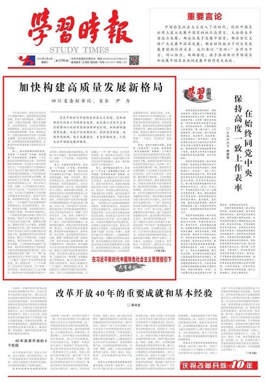 編者按:8月8日,《學(xué)習(xí)時報》頭版頭條“在習(xí)近平新時代中國特色社會主義思想指引下”欄目刊載四川省委副書記、省長尹力的署名文章《加快構(gòu)建高質(zhì)量發(fā)展新格局》,本網(wǎng)今日予以轉(zhuǎn)載: