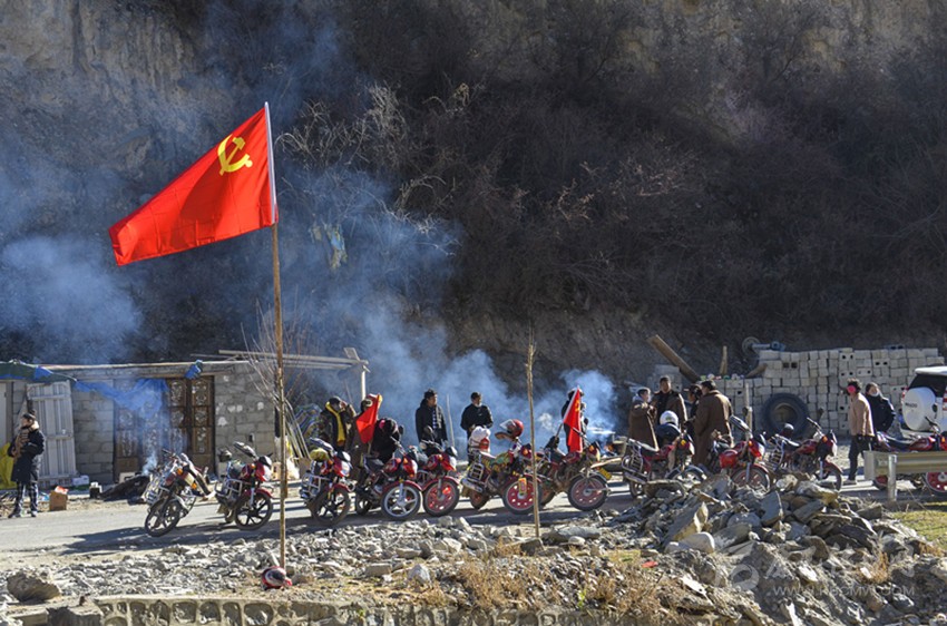 白玉縣山巖鄉(xiāng)摩托車隊(duì)以黨旗為引領(lǐng),及時(shí)支援受災(zāi)害威脅的村民。 本網(wǎng)資料圖