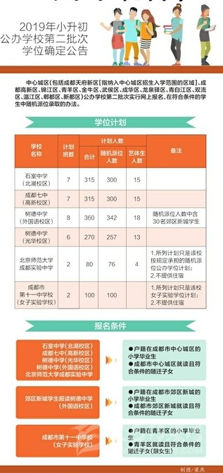 6月17日,記者從成都市教育局獲悉,根據(jù)《成都市教育局關(guān)于2019年小學(xué)畢業(yè)生初中入學(xué)工作的通知》(成教函〔2019〕35號)規(guī)定,中心城區(qū)(包括成都天府新區(qū)[指納入中心城區(qū)招生入學(xué)范圍的區(qū)域]、成都高新區(qū)、錦江區(qū)、青羊區(qū)、金牛區(qū)、武侯區(qū)、成華區(qū)、龍泉驛區(qū)、青白江區(qū)、雙流區(qū)、溫江區(qū)、郫都區(qū)、新都區(qū))公辦學(xué)校第二批次(詳見學(xué)位計(jì)劃表)實(shí)行網(wǎng)上報(bào)名、在符合條件的學(xué)生中隨機(jī)派位錄取的辦法。網(wǎng)上申報(bào)時(shí)間為6月22日10:00至25日17:00;7月2日16:00,成都市招考辦將在服務(wù)平臺上載入派位結(jié)果,學(xué)校公布錄取學(xué)生名單。