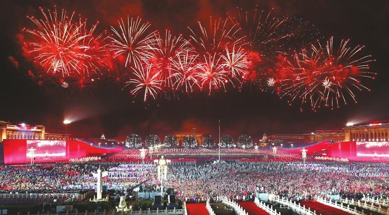 此刻,萬(wàn)花綻放,“人民萬(wàn)歲”造型照亮廣場(chǎng),照亮每個(gè)人的臉龐。