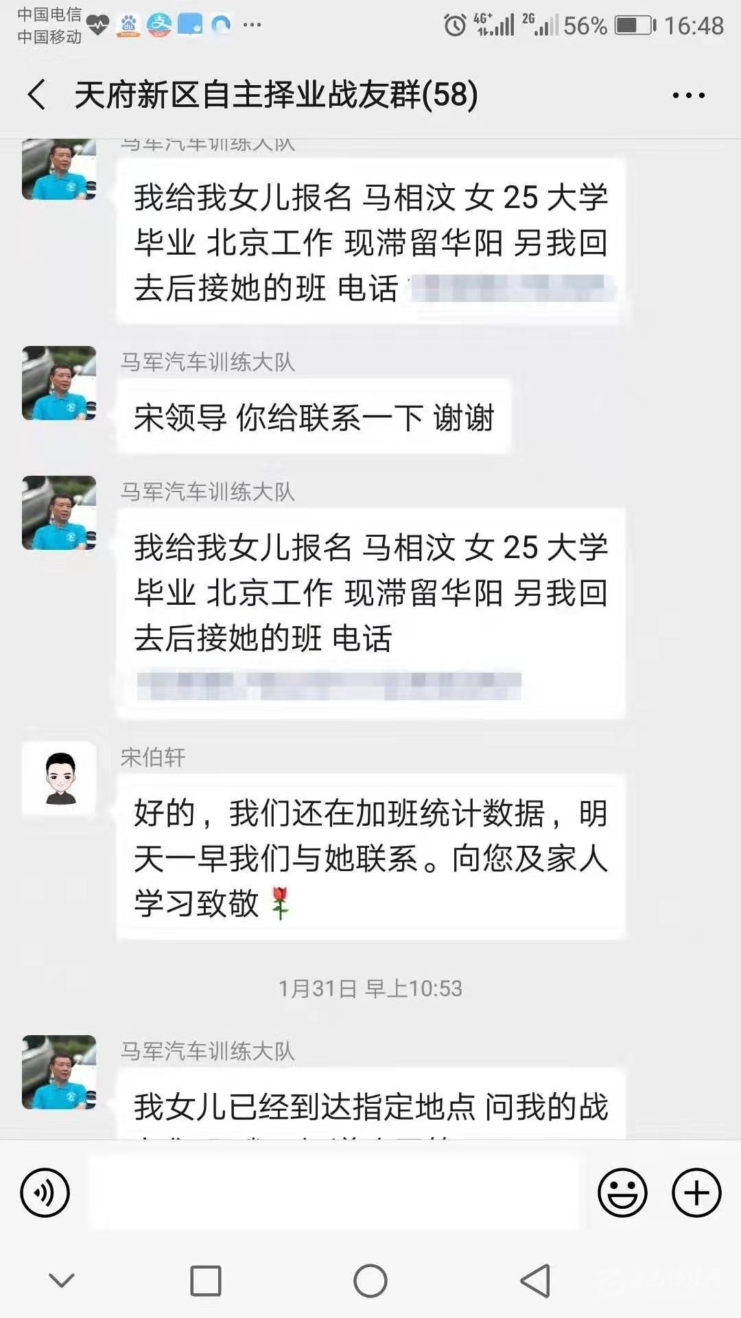 “我給我女兒報(bào)名,馬相汶,女,25歲,大學(xué)畢業(yè),北京工作,現(xiàn)滯留成都,另我回去后接她的班?!苯眨粭l微信截圖傳遍了天府新區(qū)退役軍人的朋友圈。