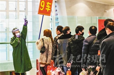 為在疫情期間幫助外出務(wù)工人員安全、順利返崗就業(yè),宜賓市先后采用專(zhuān)列、包車(chē)、包機(jī)等多種方式免費(fèi)運(yùn)送務(wù)工人員前往省內(nèi)外各地市。圖為當(dāng)日宜賓西站客運(yùn)員引導(dǎo)外出務(wù)工人員有序登車(chē)。