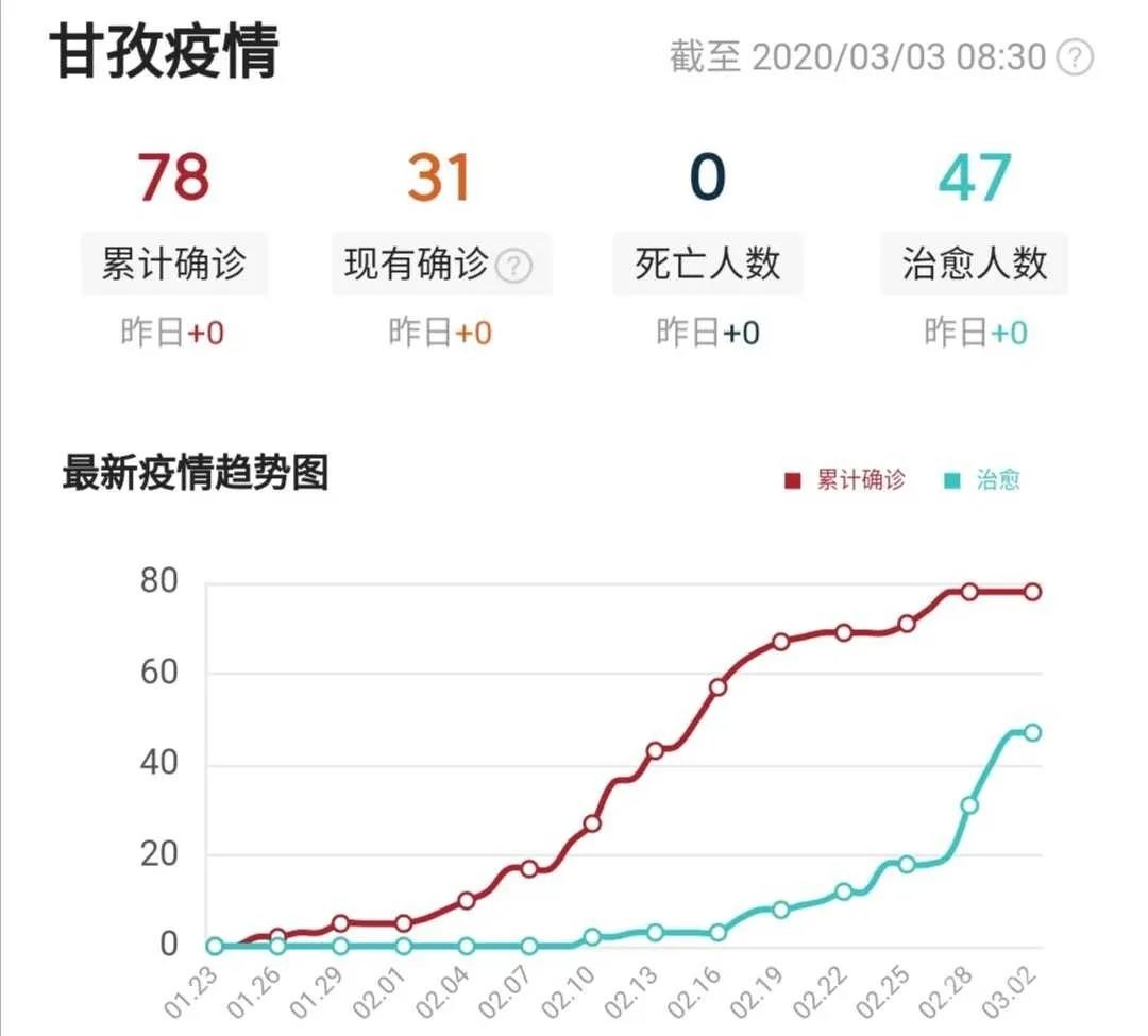 截至3月2日24時,我州累計報告確診病例78例,累計治愈出院47人(道孚縣42人、康定市2人、色達(dá)縣2人、稻城縣1人),其余31人均在定點醫(yī)院隔離治療,203名密切接觸者正在接受醫(yī)學(xué)觀察。我州道孚縣連續(xù)4天無確診病例報告,其余17個縣(市)連續(xù)28天無確診病例