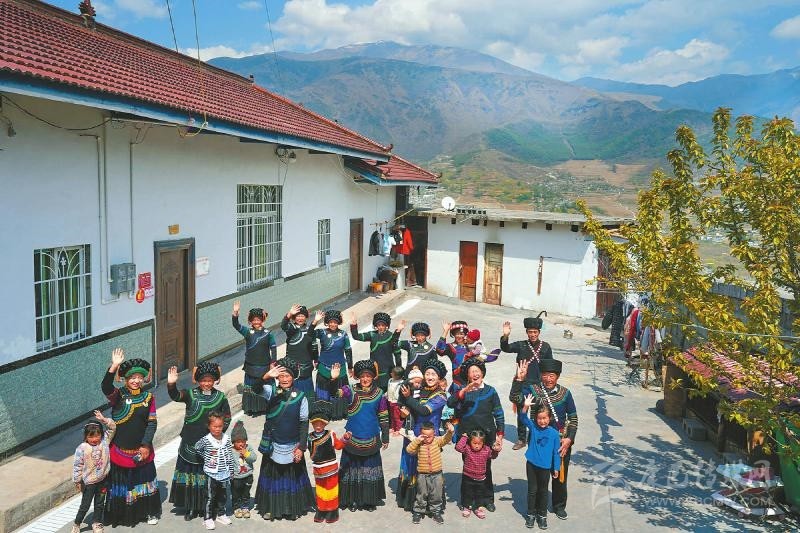 越西縣鐵西鄉(xiāng)阿支吾村,村民們?cè)谪毨?hù)馬海大爾(右一)新居前合影。