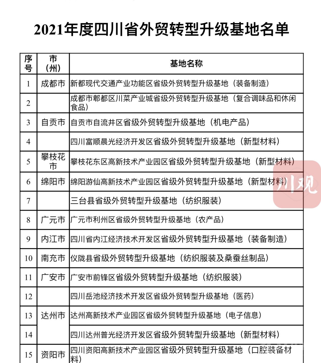 建設(shè)外貿(mào)轉(zhuǎn)型升級基地是穩(wěn)定和暢通外貿(mào)產(chǎn)業(yè)鏈、供應(yīng)鏈、推進貿(mào)易高質(zhì)量發(fā)展的重要舉措。2020年,商務(wù)廳等省級9部門印發(fā)了《關(guān)于加快推進四川省外貿(mào)轉(zhuǎn)型升級基地建設(shè)的實施意見(2020—2025年)》,計劃用5年時間,在全省培育外貿(mào)基地40個。2020年,首批15個基地率先亮相。
