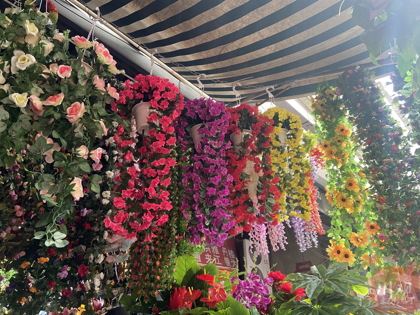 在荷花池批發(fā)市場的一家假花店,幾個嬢嬢正七嘴八舌地指揮老板在從天花板垂下來的枝條中,選出最亮眼的那叢。