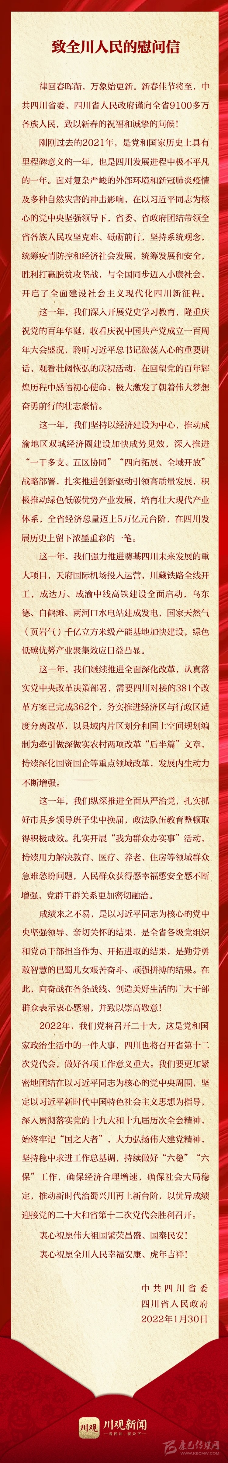 新春佳節(jié)將至,中共四川省委、四川省人民政府發(fā)出慰問信,向全省9100多萬各族人民,致以新春的祝福和誠(chéng)摯的問候!衷心祝愿?jìng)ゴ笞鎳?guó)繁榮昌盛、國(guó)泰民安!衷心祝愿全川人民幸福安康、虎年吉祥!
