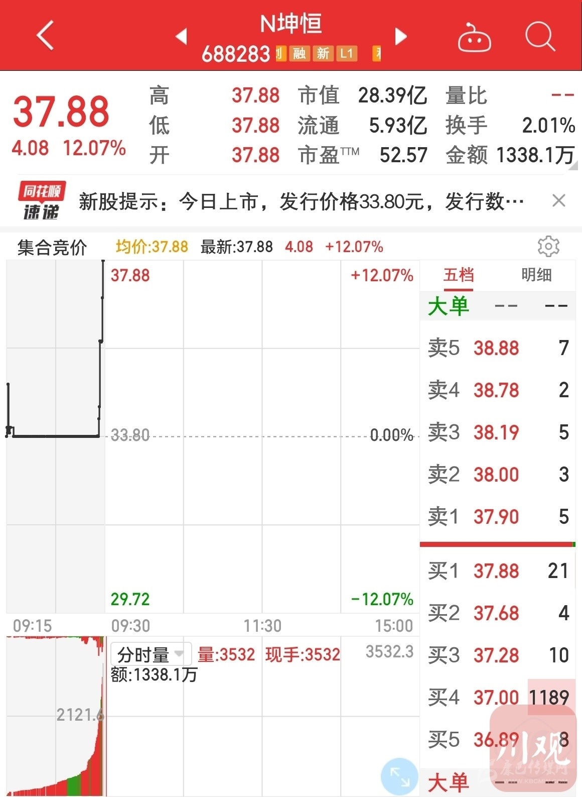 2月15日上午,四川企業(yè)成都坤恒順維科技有限公司在上海證券交易所西部基地敲響上市鑼聲。首日發(fā)行價(jià)33.8元,開盤價(jià)為37.88元,漲幅12.07%。
