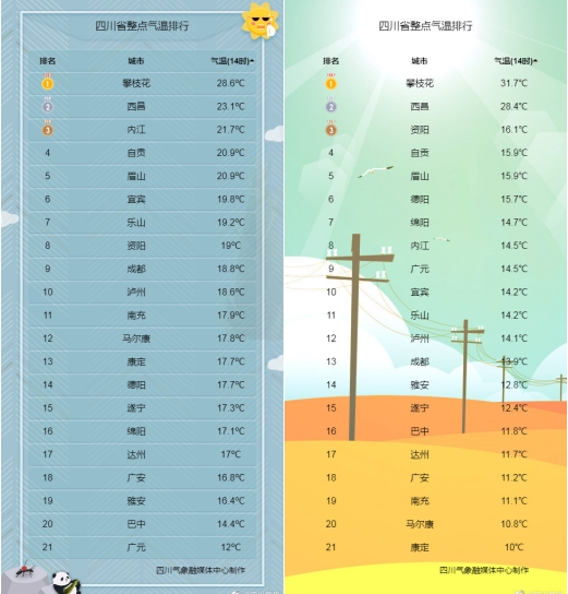 3月23日(左圖)與3月22日(右圖)四川各城市實(shí)況氣溫對(duì)比。