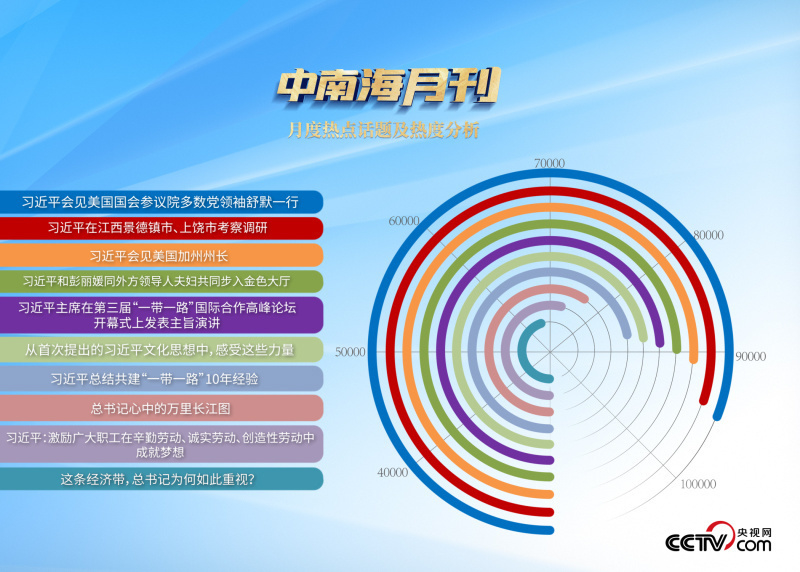 央視網(wǎng)“智聞”系統(tǒng)提取分析10月全網(wǎng)時政新聞熱點顯示,“習(xí)近平主席會見美國國會參議院多數(shù)黨領(lǐng)袖舒默一行”“習(xí)近平會見美國加州州長”“習(xí)近平主持召開進一步推動長江經(jīng)濟帶高質(zhì)量發(fā)展座談會”等話題最受網(wǎng)民關(guān)注。