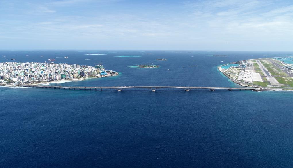 ??這是航拍的連接馬爾代夫首都馬累和機(jī)場島的中馬友誼大橋。