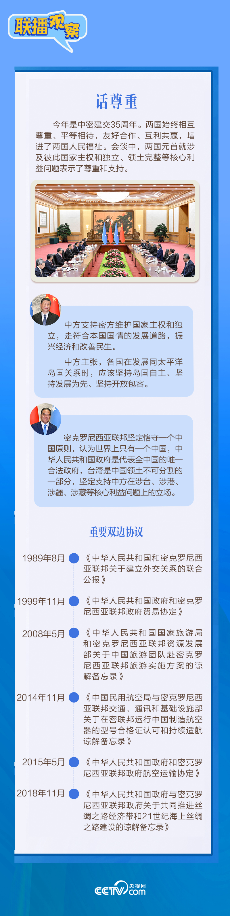 聯(lián)播+應(yīng)習(xí)近平主席邀請,密克羅尼西亞聯(lián)邦總統(tǒng)韋斯利·西米納于4月5日至12日對中國進行國事訪問。4月9日下午,習(xí)近平主席在北京人民大會堂同西米納總統(tǒng)舉行會談,就雙邊關(guān)系發(fā)展及共同關(guān)心的問題深入交換意見。雙方會談哪些細節(jié)值得關(guān)注?央視網(wǎng)《聯(lián)播觀察》帶您了解。