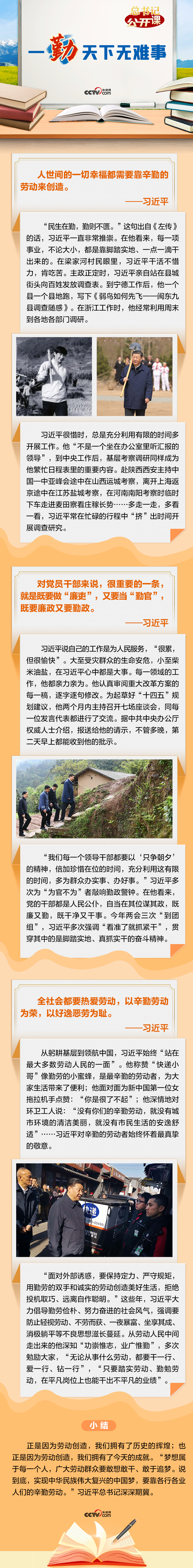 習(xí)近平總書記強(qiáng)調(diào),“一勤天下無難事”,“實(shí)現(xiàn)中華民族偉大復(fù)興的中國夢,要靠各行各業(yè)人們的辛勤勞動(dòng)”?!扒凇笔秦灤┛倳洀恼牡钠焚|(zhì),是對(duì)他夙夜在公、勤勉工作最為凝練的概括。