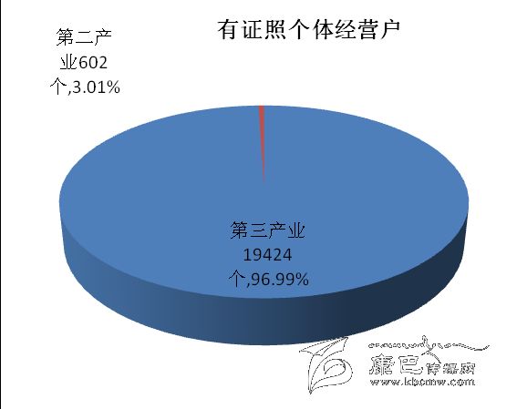在有證照個(gè)體經(jīng)營戶中,第二產(chǎn)業(yè)占3.01 %;第三產(chǎn)業(yè)占96.99 %。有證照個(gè)體經(jīng)營戶從業(yè)人員中,第二產(chǎn)業(yè)占3.82 %,第三產(chǎn)業(yè)占96.18 %。