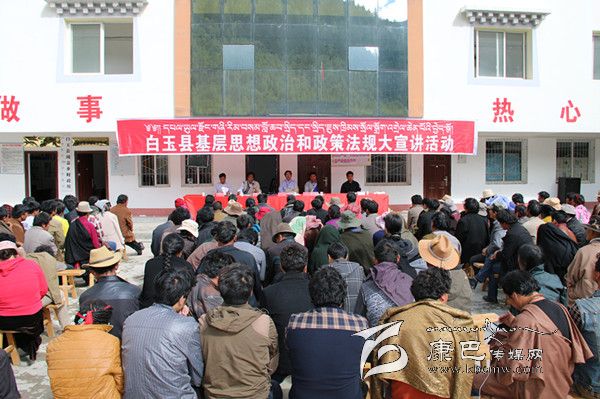 ?。冈碌陌子?,烈日當頭,秋高氣爽。31日上午,絨蓋鄉(xiāng)政府大院內(nèi),白玉縣基層思想政治和政策法規(guī)大宣講活動正在這里精彩“上演”,400多名前來“聽課”的各村群眾正津津有味地品味著縣宣講團成員松吉尼瑪通俗易懂的藏語大宣講。從黨的十八大到十八屆三中全會精神,從糧食直補到低保、新農(nóng)保,從養(yǎng)老保險、殘疾人幫扶到相關(guān)法律法規(guī),宣講者深入淺出,傾聽者全神貫注。