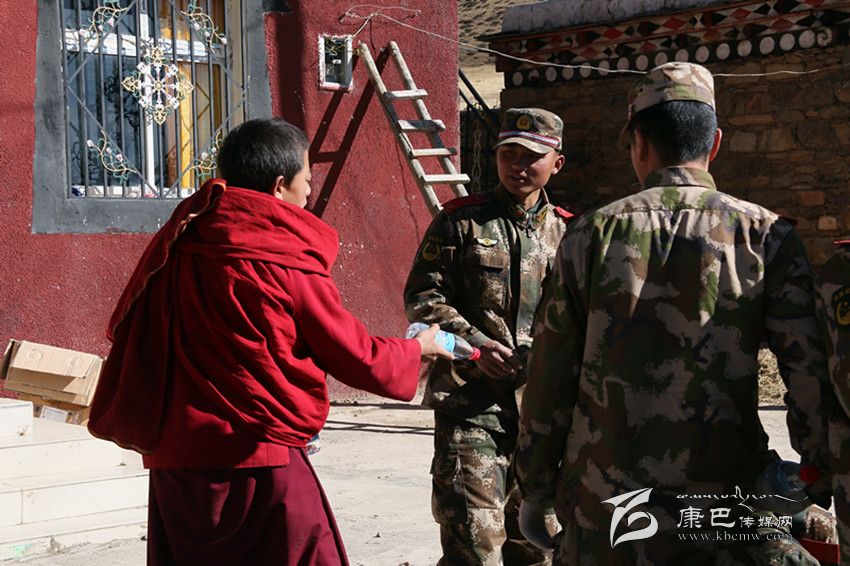 27日上午,記者一行來到金龍寺,看見院子里已經(jīng)搭起了一排排整齊的救災(zāi)棉帳篷,當(dāng)?shù)馗刹亢臀渚俦聫R僧人一道加固帳篷,僧人們從自己的帳篷里抱出礦泉水,送到武警戰(zhàn)士們手中。
