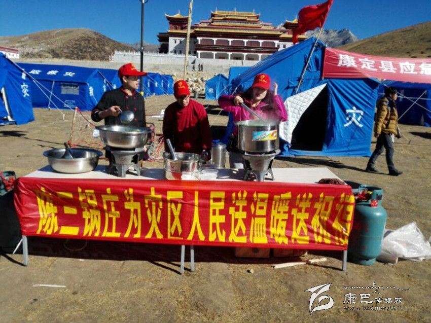 11月28日中午,記者來(lái)到康定塔公鎮(zhèn)祖慶小學(xué)采訪。在現(xiàn)場(chǎng),一群戴著紅帽子的人正在將熱氣騰騰的紅燒肉一勺一勺的分發(fā)到同學(xué)們碗中。仔細(xì)一看,現(xiàn)場(chǎng)還有一幅標(biāo)語(yǔ),上面寫著“陳三鍋莊為災(zāi)區(qū)人民送溫暖送祝福”的字樣。記者揉了揉眼,確定沒(méi)看錯(cuò)。原來(lái),陳三鍋莊是關(guān)了康定的門店,組織人員到災(zāi)區(qū)參與抗震救災(zāi)來(lái)了。