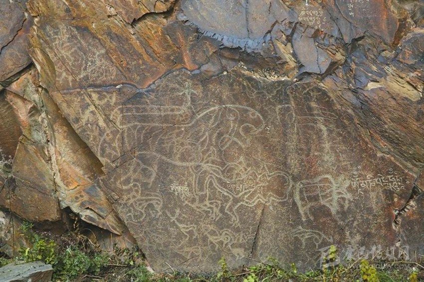 省考古院李飛介紹,其中一處巖畫上,還能看到古藏文的題記。這些圖像均為密點(diǎn)鑿刻,創(chuàng)作者先用細(xì)線在崖壁上刻劃出輪廓,再通過密點(diǎn)敲鑿出圖像。它們中,有的是通體剪影式,有的則是粗線條輪廓式。