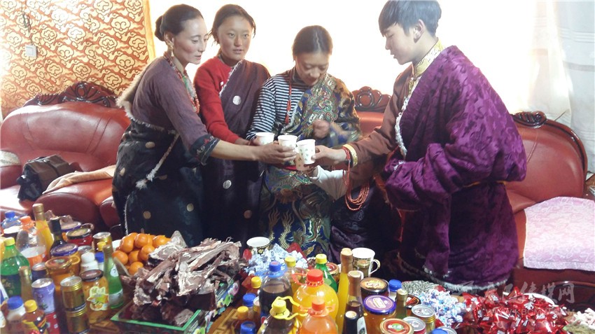 根秋卓瑪一家是俄多瑪鄉(xiāng)的村民,初一一大早,根秋卓瑪就穿上節(jié)日的盛裝?!敖裉煳覀円涯曦洈[放出來,等親戚朋友祈?;貋恚覀円患揖蜁谝黄穑页?、吃著美食、唱著山歌,高高興興歡度藏歷新年?!备镒楷斦f。