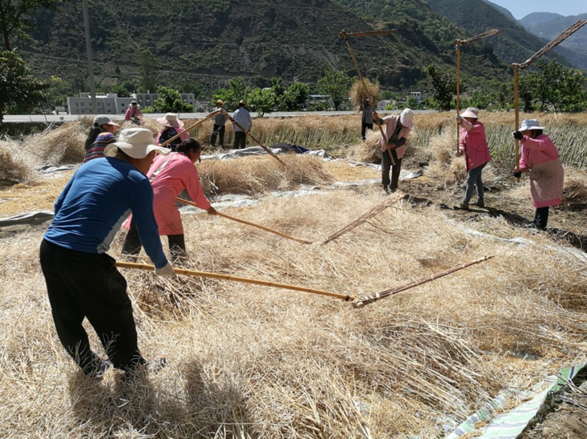 本網(wǎng)訊(尼胡克布 李娟 文/圖)5月12日,在瀘定縣德威鄉(xiāng)下河壩村農(nóng)田里,村民李永強正組織親戚朋友20余人,對自家3畝多油菜進行搶收。村民們有的負責(zé)把一捆捆曬干的油菜抱到油布上,有的負責(zé)用農(nóng)具進行打籽,現(xiàn)場一派繁忙的景象。