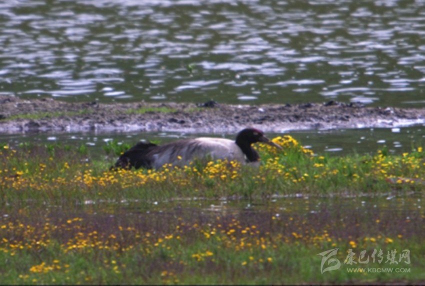 黑頸鶴是唯一生長(zhǎng)繁殖在高原的鶴類(lèi),國(guó)家一級(jí)保護(hù)動(dòng)物,冬季10月左右遷往云貴高原等低緯度地區(qū),2月下旬陸續(xù)返遷回到高原,到達(dá)白玉縣保護(hù)區(qū)時(shí)間一般在4月下旬。這次黑頸鶴繁殖巢穴位于麥拉降措湖邊一塊四面環(huán)水的平臺(tái)上,鮮花盛開(kāi),相對(duì)隱秘。