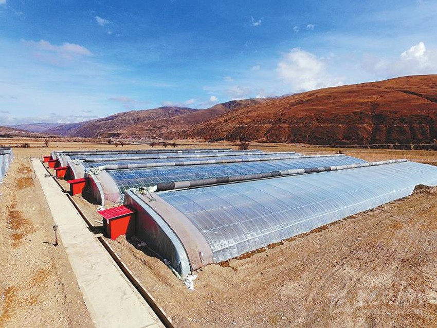 爐霍縣創(chuàng)新飛地扶貧模式,在海拔較低地勢(shì)平緩的地方建蔬菜大棚發(fā)展產(chǎn)業(yè),助貧困戶(hù)脫貧。陳麗 攝