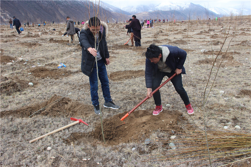 當(dāng)天早上10時(shí)許,洛須鎮(zhèn)正科鄉(xiāng)曲德村的植樹現(xiàn)場(chǎng)一派熱火朝天的景象。參加植樹的人們,個(gè)個(gè)熱情洋溢、干勁十足。有的拿鐵鍬,有的提水桶,有的栽樹、蓋土……每一道工序都嚴(yán)格按要求進(jìn)行。兩個(gè)小時(shí)后,一排排樹苗整齊地佇立在藍(lán)天下,就像列隊(duì)整齊等待檢閱的士兵。