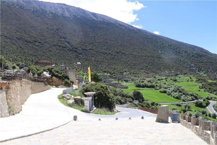 從觀景平臺向村子進(jìn)發(fā),一棟棟用石塊砌成的藏房次第映入眼簾,每一棟藏房都有獨立的院落,院墻上是堆放整齊的木柴,墻邊是造型別致的花臺,有的房頂上還掛著五星紅旗。走到村口,黑化通村路變成了硬化聯(lián)戶路,道路寬敞整潔,路旁有太陽能路燈、電子監(jiān)控、綠化花草和公共廁所;村中央的廣場上聚滿了人,他們有的是外來游客、有的是當(dāng)?shù)卮迕瘢械脑跁裰栭e聊,有的在對著美景拍照。在村里,記者還發(fā)現(xiàn)有幾個小賣部、不少私家車和好幾大片長勢良好的菜地,地里有一些人在勞作。